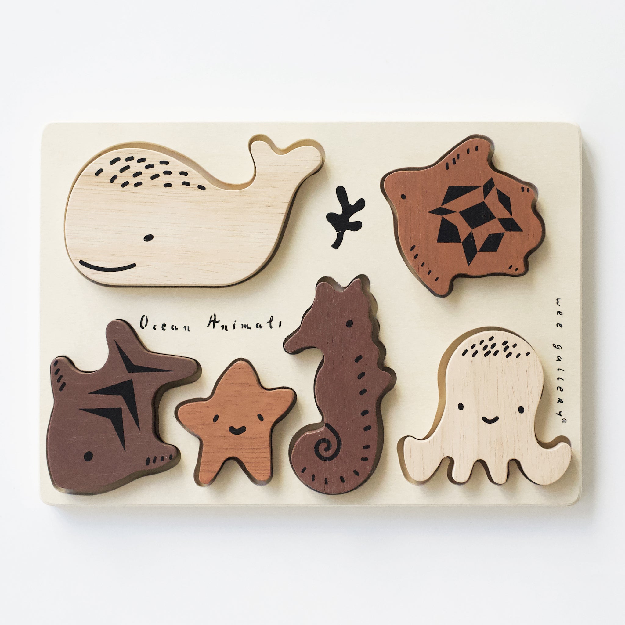 Ocean Tray Puzzle: Made of sustainably sourced natural rubberwood. Do not submerge in water, do not use for teething.